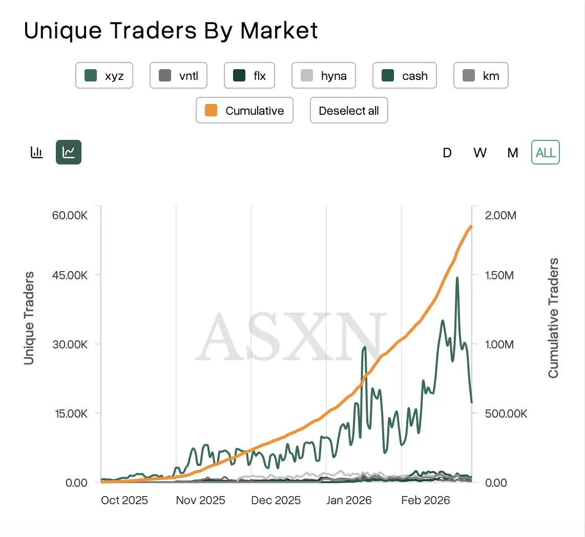 ในแง่ลึก ยอดจำนวนเทรดเดอร์อิสระบน HIP-3 ได้สะสมเกิน 1.85 แสนราย (หมายเหตุ: หากกระเป๋าเงินเดียวกันเชื่อมต่อในวันที่ต่างกัน จะนับเป็นกระเป๋าเงินสองใบ) ในรอบหนึ่งเดือนที่ผ่านมา มีเทรดเดอร์ใหม่เข้ามากว่า 81,000 ราย ซึ่งเป็นการยืนยันความต้องการในการซื้อขายสินทรัพย์ที่เป็นโทเคน