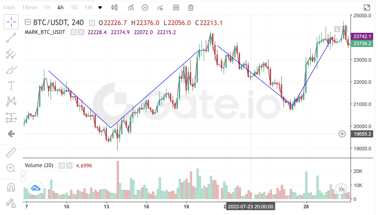 Yukarıdaki Gate vadeli işlemlerinin 4 saatlik mum grafiğidir. 28 Temmuz ile 30 Temmuz arasında BTC'nin iki tur V şeklinde geri dönüş yaşadığı görülebiliyor. İlk V şeklindeki modele göre, fiyat önce 23.000 ABD Dolarından 19.000 ABD Dolarına düştü, ardından güçlü bir yükseliş eğilimi başlatmak için tersine döndü ve sonunda toplamda %25'ten fazla artışla 24.000 ABD Dolarına ulaştı.