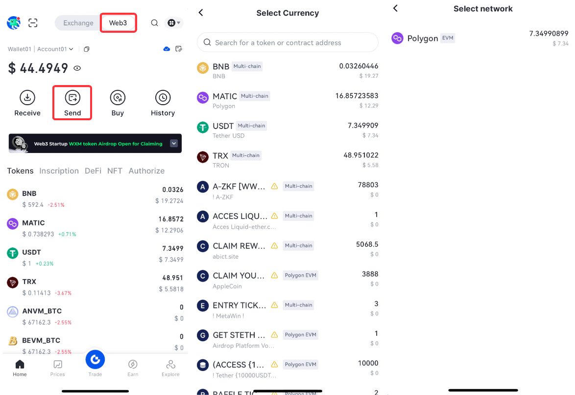 Web3 arayüzünde "Gönder "e tıklayın, aktarmak istediğiniz coini seçin ve ardından ağı seçin.