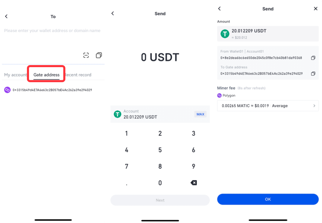 "Gönder" arayüzünde "Gate Adresini "seçin, gönderilecek miktarı doldurun, bilgilerin doğru olduğunu onaylayın ve "Tamam "a tıklayın.