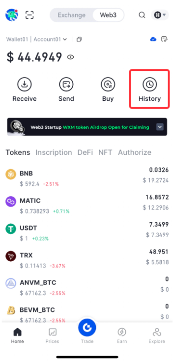 Gönderdikten sonra, siparişi Web3 "Geçmiş" bölümünde görüntüleyebilirsiniz.