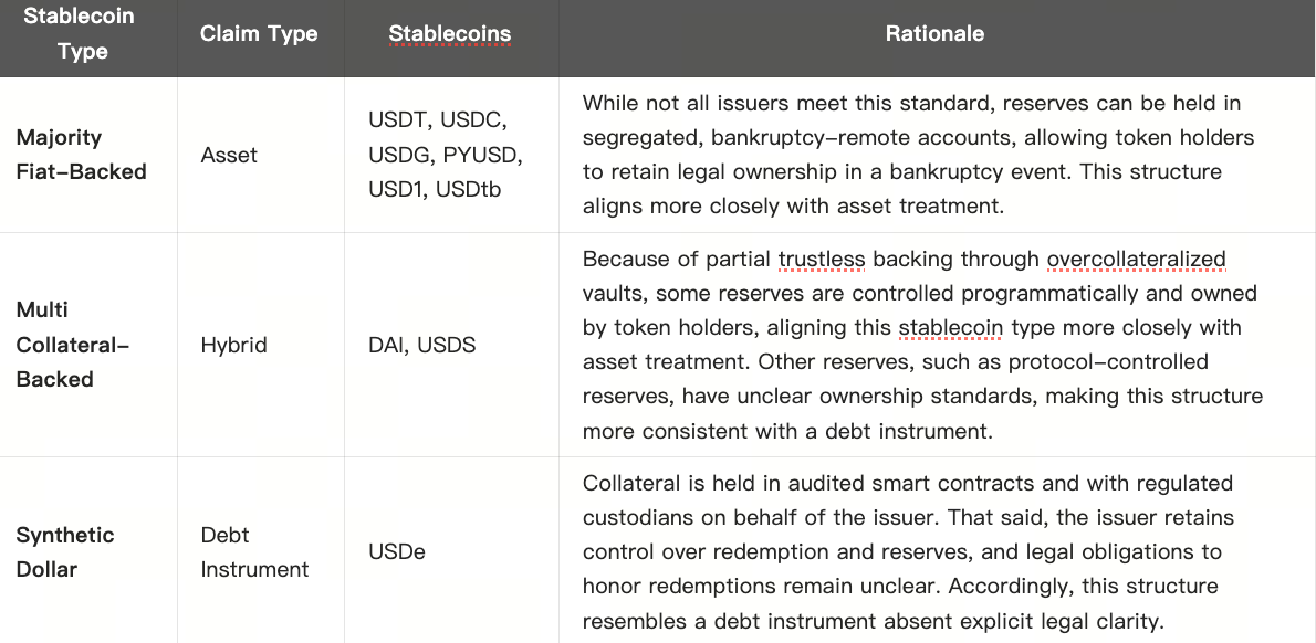The classification depends primarily on who controls the reserves that back the token and whether that party is legally obligated to honor redemptions. While most issuers might intend to fulfill redemptions even under stress, without a clear legal obligation or user-controlled reserves, the token functions more like a debt instrument. This distinction determines whether holders retain enforceable rights to the underlying collateral in a worst-case scenario.