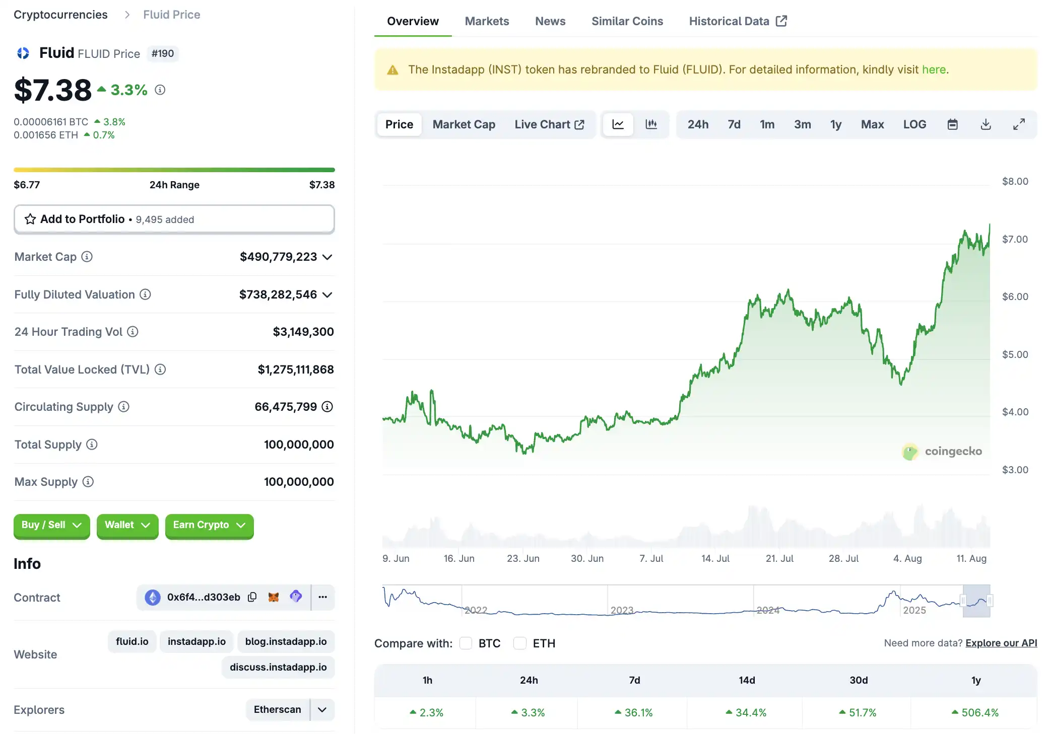 Recently, Fluid has become one of the focal points in the DeFi market: on August 4th, Fluid’s daily on-chain trading volume temporarily surpassed Uniswap, reaching approximately $1.5 billion, driving the price of $FLUID to soar 14.4% on that day. As of now, Fluid has risen to $7.38, with a 7-day increase of 36.1% and a 30-day increase of 51%.