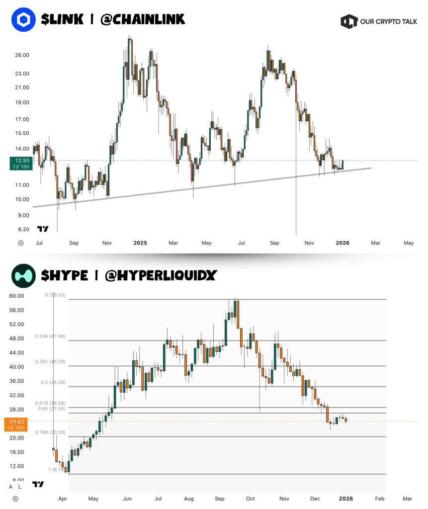 Crypto markets love a good rivalry, especially when leadership keeps changing. Hyperliquid price dominated conversations through 2025, while LINK price spent much of that year trying to regain its footing. A fresh shift appears to be forming as 2026 begins, and charts are starting to tell a different story. According to analyst Our Crypto Talk, the balance between HYPE and LINK may already be tilting again. Hyperliquid entered 2025 with momentum and never really let go. HYPE price surged as the project gained attention in DeFi, managing to outperform LINK price over the year. Our Crypto Talk pointed out that HYPE flipping LINK during 2025 reflected how quickly capital rotated toward newer narratives. That move mattered because Chainlink has long been viewed as a core DeFi infrastructure name. Hyperliquid price outperforming LINK price signaled that traders were willing to take risk on emerging platforms. Competition from projects like ASTER also made the rally more impressive, since HYPE managed to break through during a crowded period for new protocols. Why LINK Price Is Showing Strength Going Into 2026 Momentum does not stay one sided forever. Our Crypto Talk highlighted that LINK price has started to reclaim ground in early 2026, even managing to flip HYPE in recent performance. Chainlink price action this week stands out because it held above $10 during a broader downtrend.