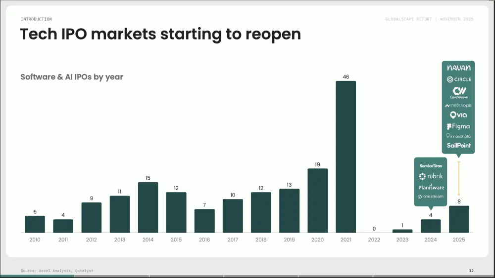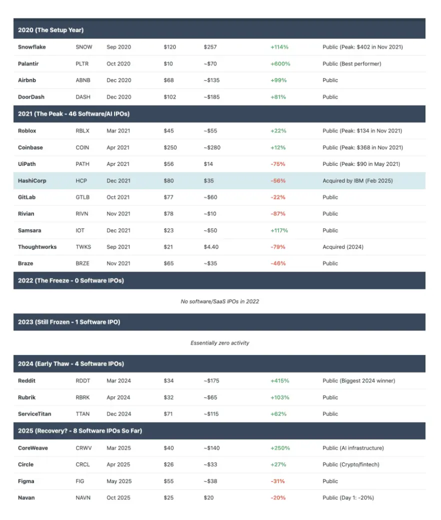 From a historical perspective, the recovery in 2025 has not yet reached a prosperous level. Data from Accel Analysis and Qatalyst show that IPOs in software and AI peaked between 2019-2021, with 13, 19, and 46 IPOs respectively. After a crash period in 2022-2023 with zero and 1 IPOs, the market entered a recovery phase in 2024-2025 with 4 and 8 IPOs.