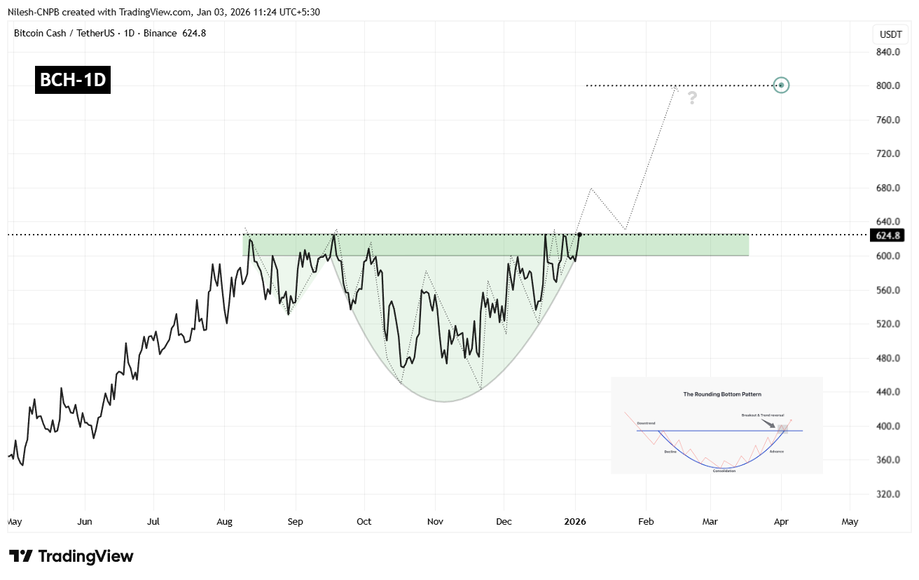 As weeks passed, BCH began to print higher lows, slowly curving upward and completing the bottoming structure. The recovery has now brought price back toward the $600–$630 resistance zone, which marks the neckline of the rounding bottom and represents a key decision area for the trend.