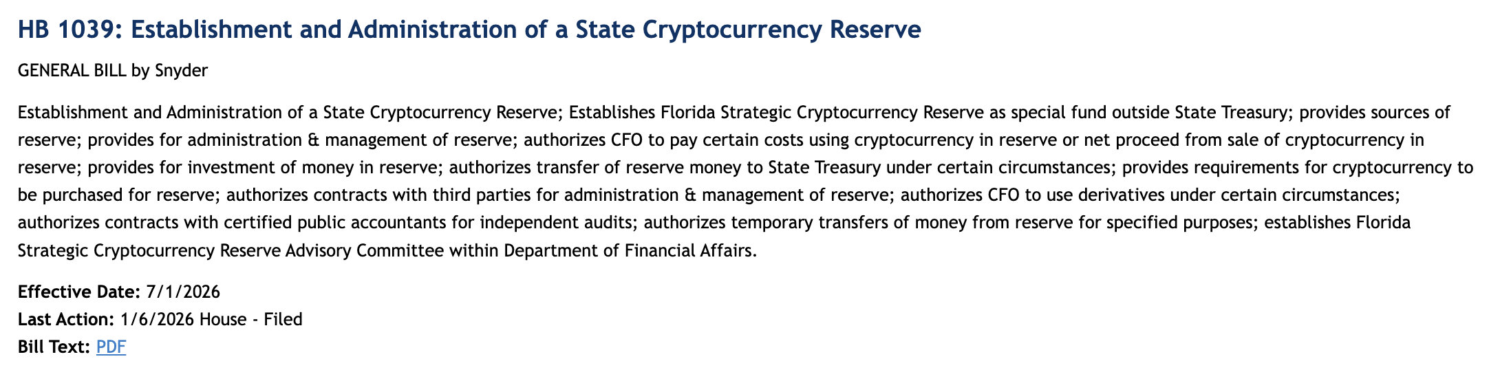 Florida lawmakers are accelerating efforts to include Bitcoin ($BTC) in the state’s strategic reserves. Republican Congressman John Snyder officially introduced House Bill 1039 (HB 1039) in January 2026, aiming to establish a dedicated “Strategic Cryptocurrency Reserve Fund.”