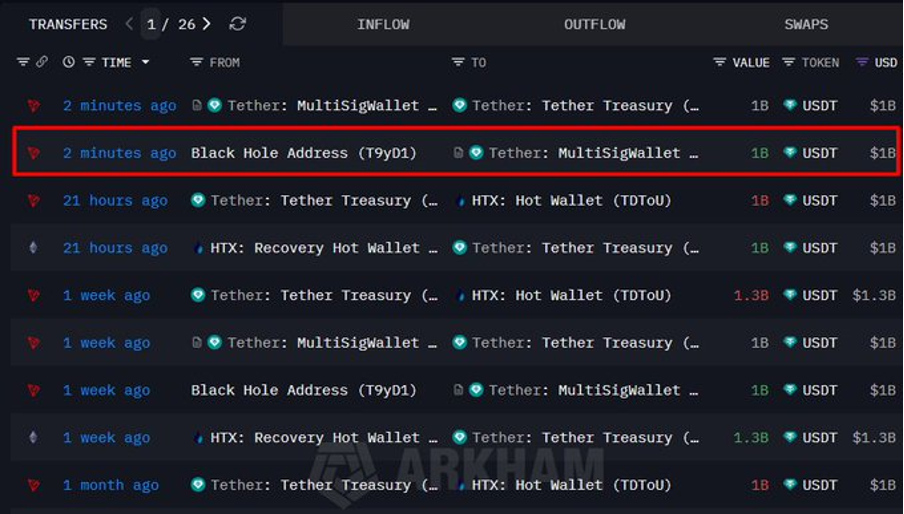 Tether expanded its USDT inventory on Tron with a $1 billion authorized mint, keeping the tokens in reserve for future demand.