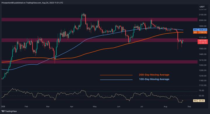 After a prolonged period of tranquil price activity near the critical level of $1.8K, there has been a significant and rapid downturn at ETH following a notable rejection. This sudden cascade has caused the price to drop below the 100-day and 200-day moving averages (MAs), indicating a bearish signal for the ETH market.