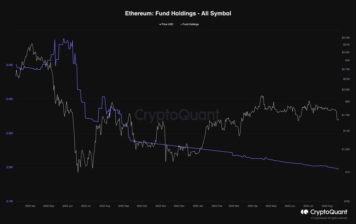 Analyzing the fund holding metric, the chart indicates a significant trend shift for Ethereum since June 2022. While Bitcoin has experienced intermittent periods of price upticks accompanied by ious fund distribution zones, Ethereum has witnessed a consistent downtrend in fund holdings and distributions during this period.