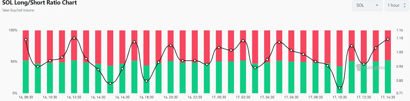 At the time of this writing, there’s a noticeable shift towards bullish sentiment among buyers, as indicated by the long/short ratio exceeding 1. This ratio, which compares the volume of buyers to that of sellers, demonstrates an increasing dominance of buying activity when it rises above 1. Presently, the ratio is at 1.0938, indicating that more than 52% of all positions are anticipating a rise in the price of Solana.