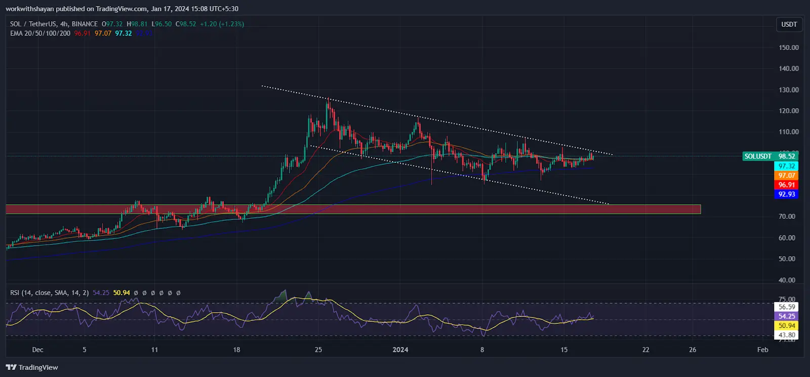 The 20-day Exponential Moving Average (EMA) is currently stable at around $97, and the Relative Strength Index (RSI) is hovering around the midpoint at level 54. This indicates an equilibrium in supply and demand. Should the price fall below the moving averages, the SOL/USDT pair might test the support line at $76.