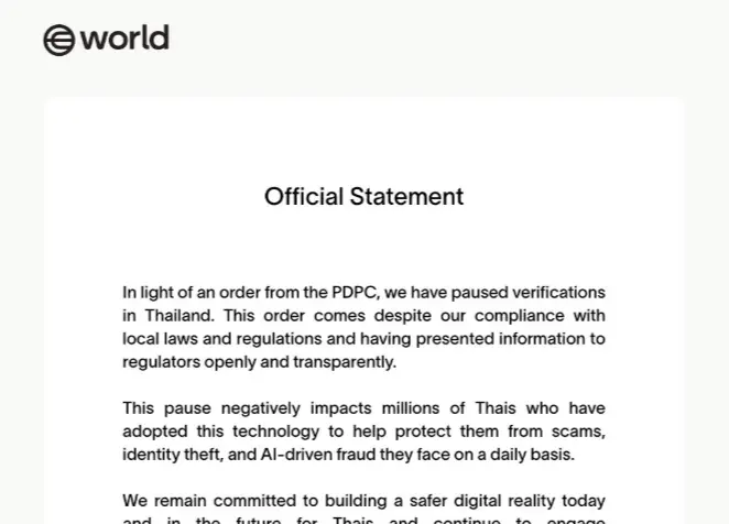 World Thailand, durdurmanın dolandırıcılık, kimlik hırsızlığı ve yapay zeka destekli dolandırıcılıklardan korunmalarına yardımcı olmak için dijital kimlik teknolojisini benimsemiş milyonlarca Thai kullanıcısını olumsuz etkilediğini vurguladı.