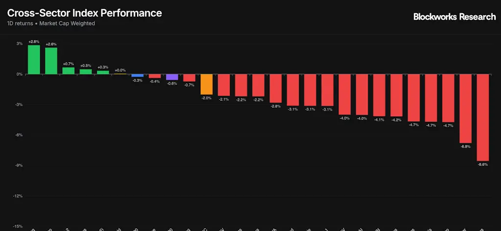Regarding cross-sector performance, the Lending (+2.8%) and Ethereum Eco (+2.6%) indices showed remarkable relative strength against the broader market downturn. AAVE (+3.0%) was the best performing asset in both indices.