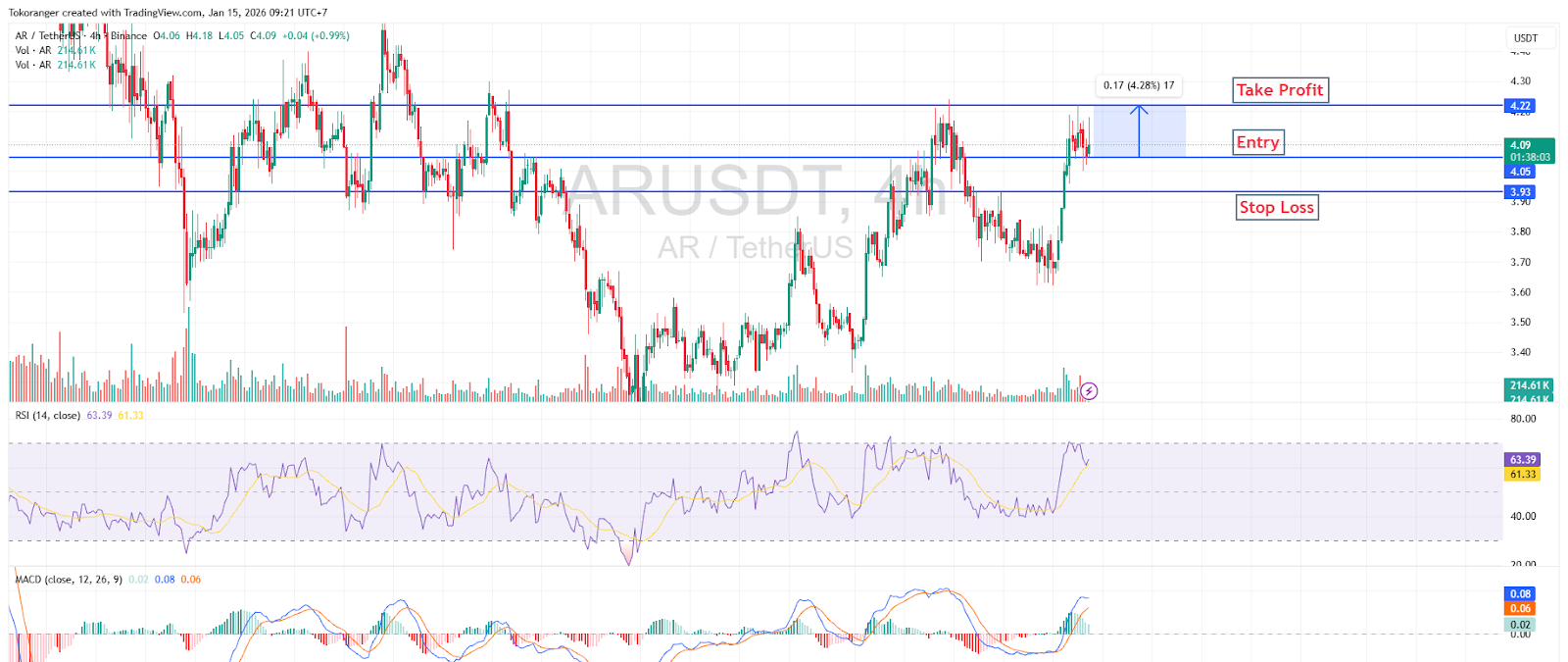 MACD is also showing potential reversal to bearish, though not yet confirmed. With this condition, AR can still be monitored for technical scenarios with entry at 3.93, stop loss at 3.78, and take profit at 4.16, while remaining cautious of renewed selling pressure.