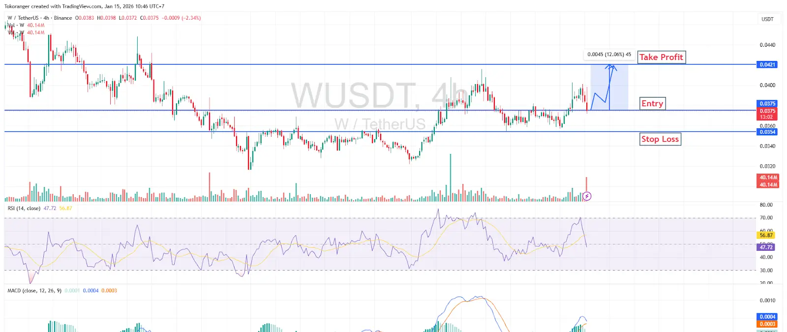 Given this condition, W is prone to correction, though rebound opportunities still exist. For trading scenarios, the entry area is at 0.0375, stop loss at 0.0354, and take profit at 0.0421, with risk management being key as selling pressure remains dominant.