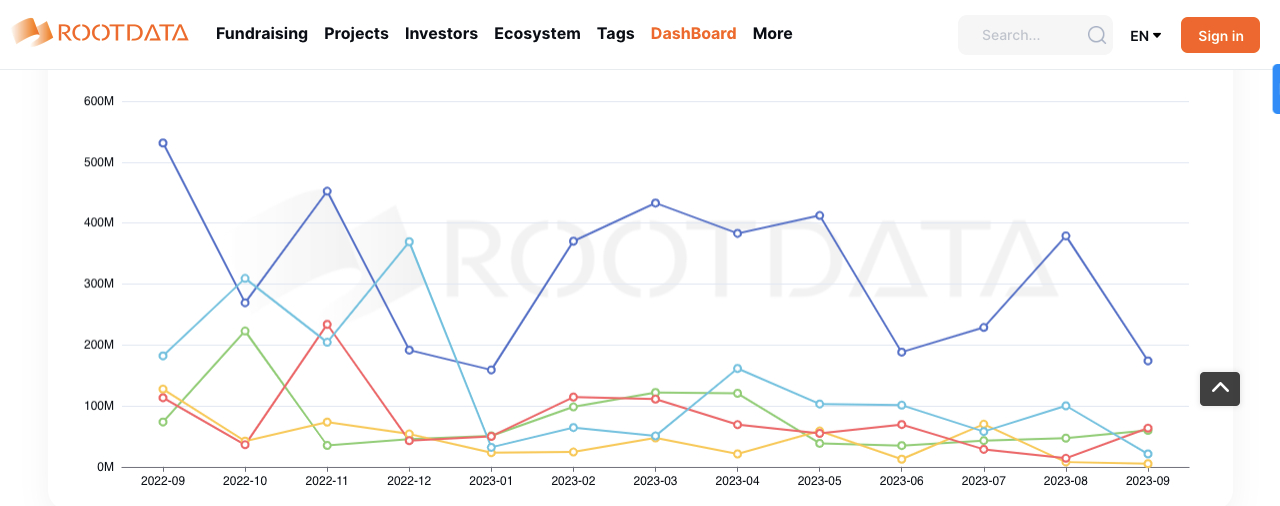 According to a dashboard created by RootData, the amount of investments flowing into the crypto space dwindled by 70% over a 365-day roadmap