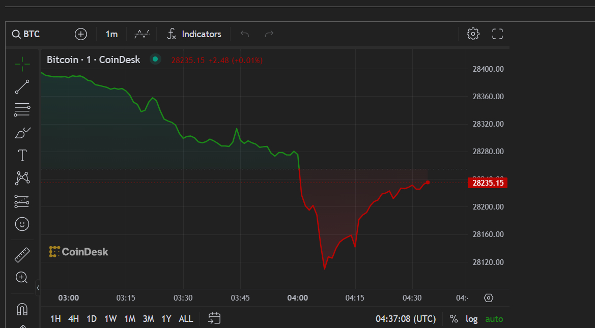 Following this upward movement, bitcoin pulled back, trading below $28,300 at the time of this report, additional CoinDesk figures reveal