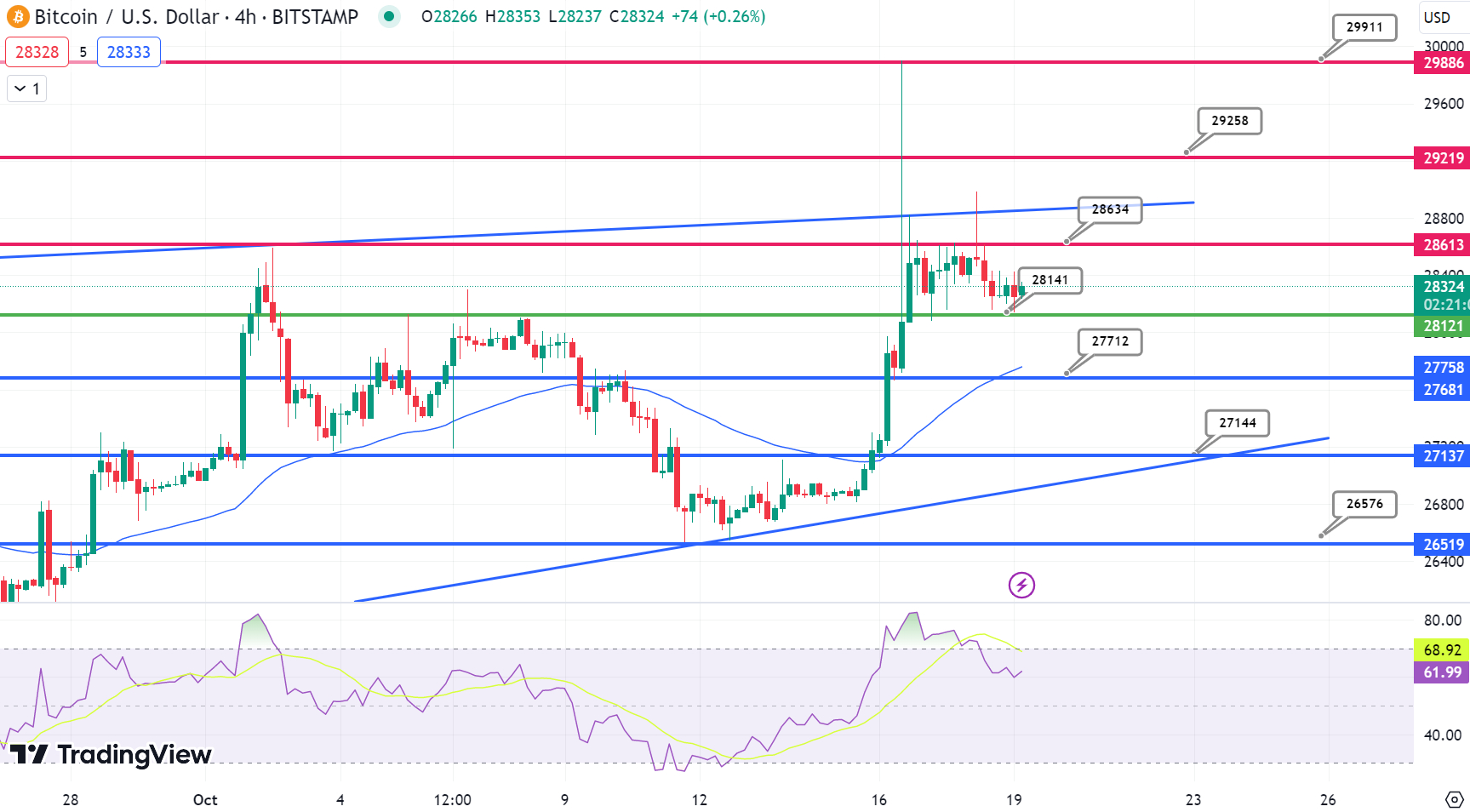 For the October 18 BTC/USD technical analysis, Bitcoin’s activity is evident on a 4-hour chart. The pivotal value for the asset is $28,582. Currently, it encounters sequential resistance at $29,237, followed by $29,921, and then at $30,500.
