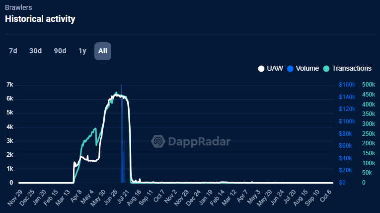 BRWL 30-day price chart. Source: coingecko.com.That said, while highly popular in July 2022, the game has seen a drop in number of transactions, volume, and unique active wallets, according to DappRadar.