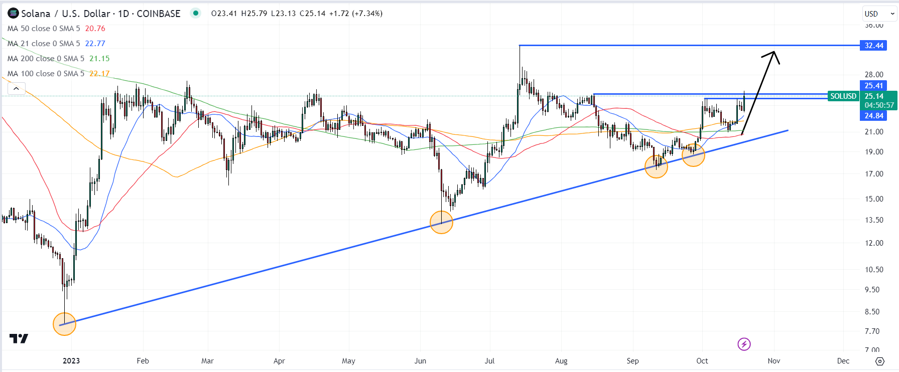 SOL Chart / Source: TradingViewSolana (SOL) is the second-best performing cryptocurrency in the top 100 by market capitalization on Thursday, having gained an impressive more than 7% on the session to hit its highest level since July above $25.