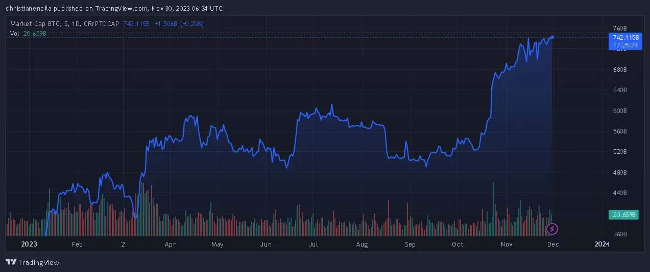 Bitcoin market cap currently at $740 billion on the daily chart: TradingView.com