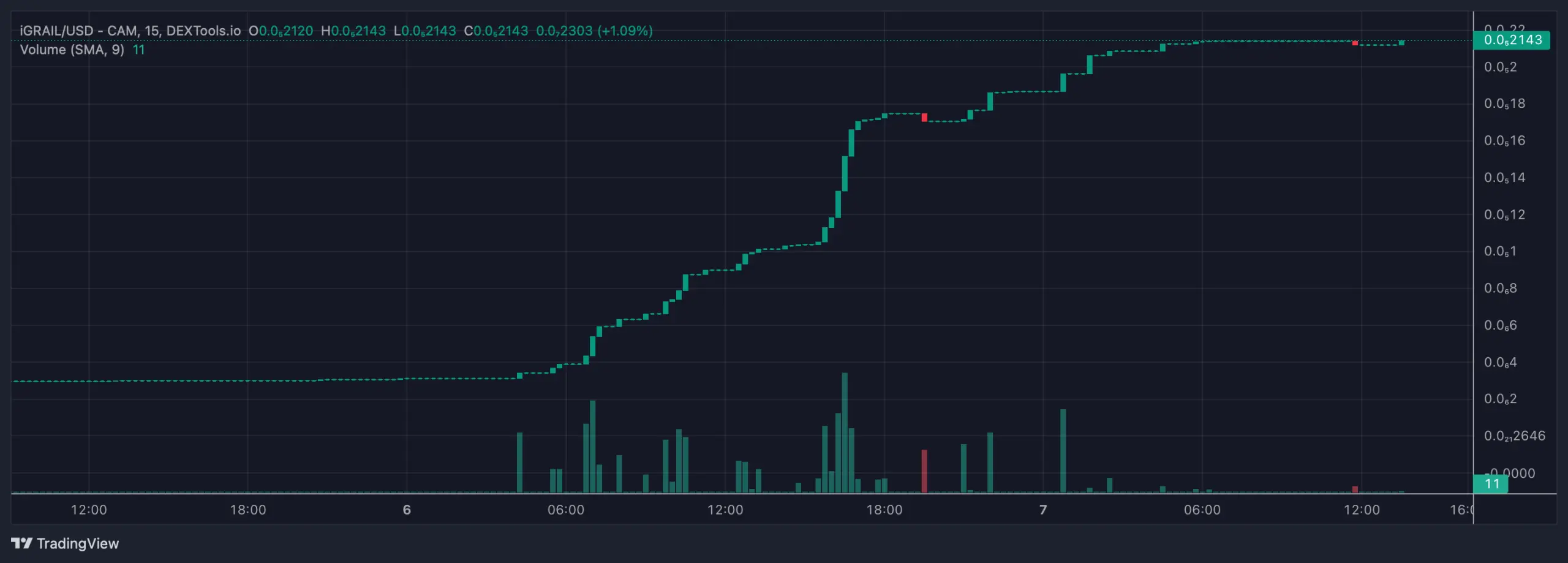 The price of Grail Inu (iGRAIL) has rocketed by more than 450% in the past 24 hours, rising to $0.000000212 after the new meme crypto listed on the Abritrum-based Camelot DEX a couple of days ago.