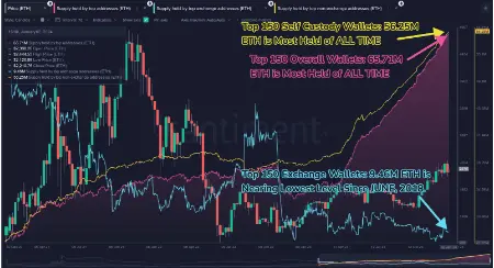 According to data from on-chain analytics platform Santiment, a record 65.71 million ETH, representing 54.67% of the total circulating supply is now held by top addresses. Out of this figure, 56.25 million ETH belong to the top 150 self-custodial wallets. Consequently, the top 150 exchange-linked wallets now hold 9.46 million ETH, nearing its lowest level since June 2018