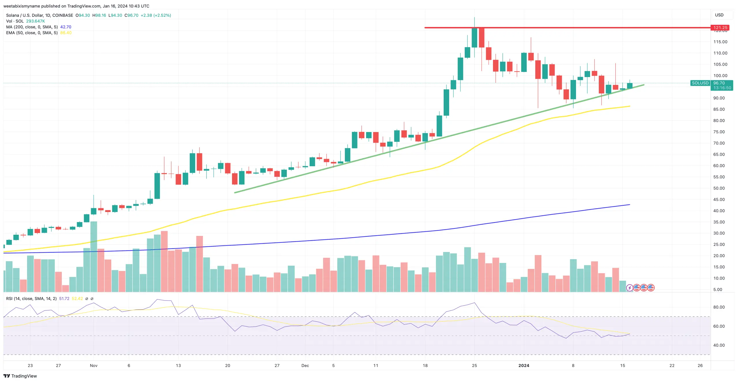 Source: TradingViewIts 30-day moving average (yellow) has also been climbing further beyond its 200-day average (blue) over the past few days, another sign that SOL remains more of a ‘buy’ right now than a ‘sell.’