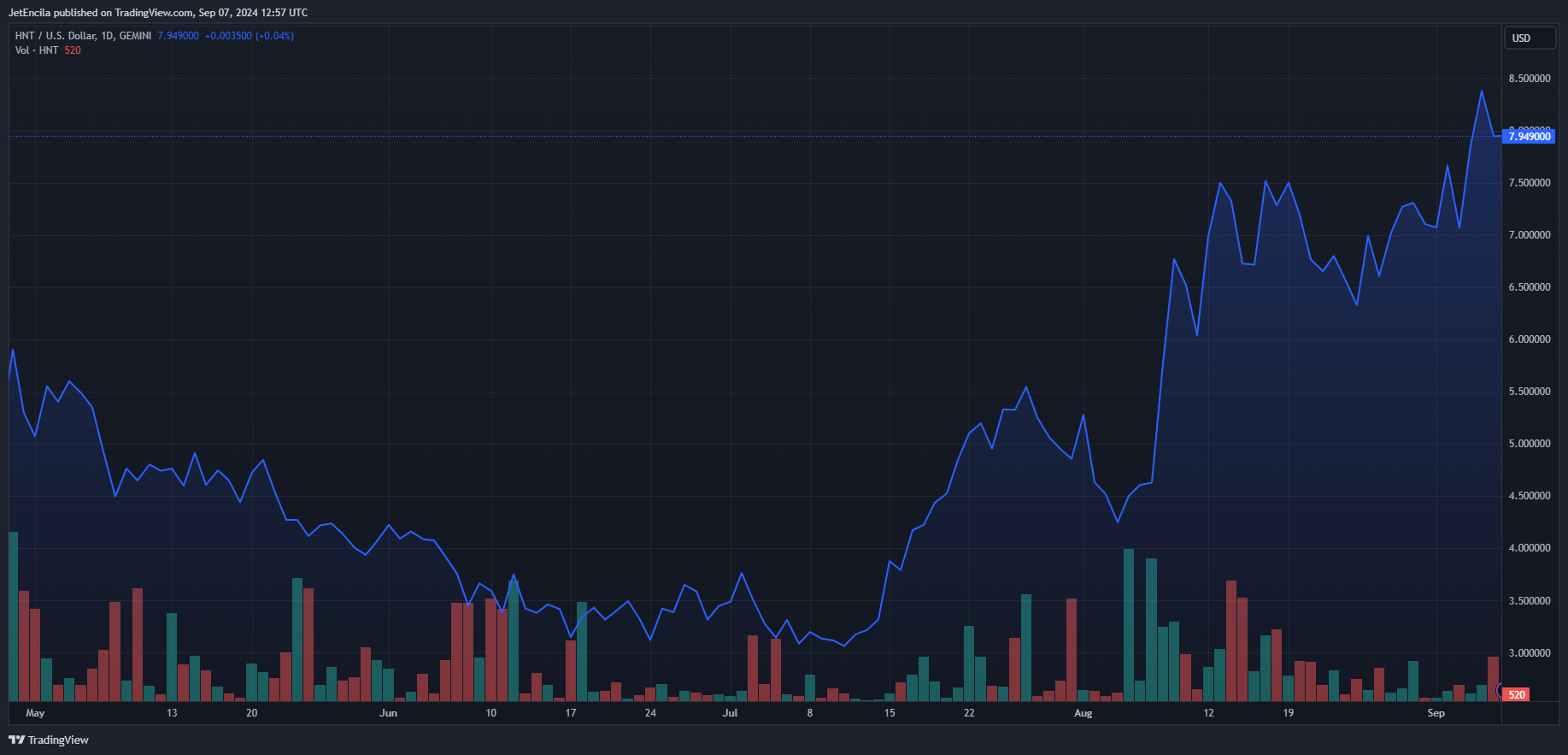 HNT’s position was the result of continued bullishness that started last month, but the current rejection by the $8.689 resistance level will drive the token downward despite positive on-chain developments. This will lead to HNT dropping below $7.455 in the short to medium term