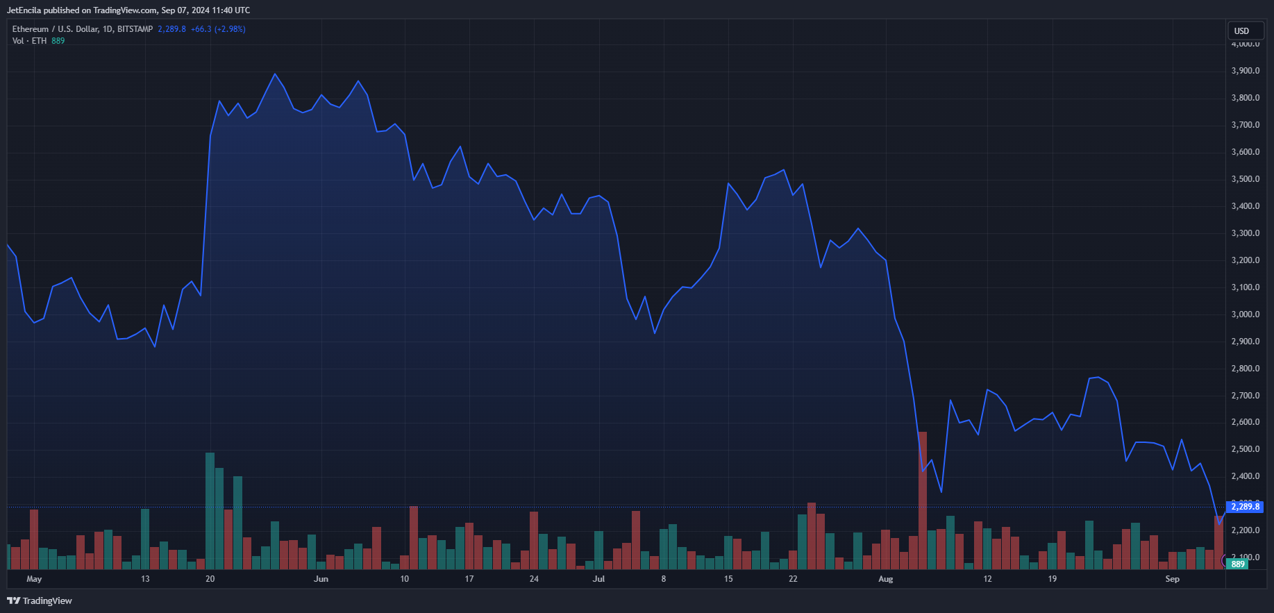 ETH is currently trading at $2,289. Chart: TradingViewSurprisingly, ETFs have had their own performances. For instance, Grayscale’s ETHE ETF witnessed an outflow as high as $10.7 million, while BlackRock’s ETHA ETF saw an inflow as low as $4.7 million.
