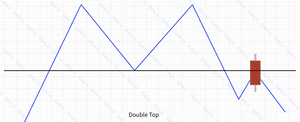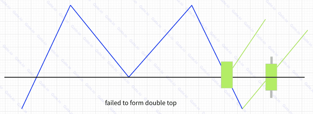 Не на всі подвійні вершини можна покладатися як на дійсні сигнали розвороту. Наприклад, якщо після формування моделі пік опускається нижче лінії шиї, але потім піднімається, щоб знову перетнути її, при цьому в цей день формується зелена свічка, розворот може не відбутися. У такому випадку трейдерам слід уникати поспішних рішень і дочекатися більш чітких сигналів, щоб почати діяти. Нижче наведено приклад невірної подвійної вершини: