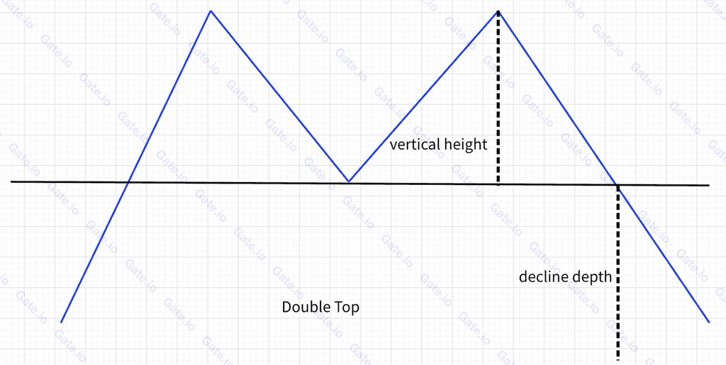Спрогнозувати глибину падіння ринку: Почніть з проведення вертикальної лінії від лінії шиї до висоти піку. Відніміть висоту цієї вертикальної лінії від значення лінії шиї, щоб визначити мінімальну глибину падіння ринку. Наступна ілюстрація детально описує цей процес вимірювання: