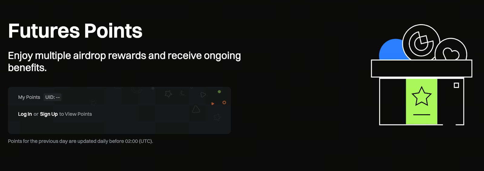 - Бали за ф'ючерсну торгівлю: найпростіший шлях до балів. Щоразу, коли користувач здійснює кваліфіковану операцію з ф'ючерсами — відкриває чи закриває позицію — система нараховує бали відповідно до торгового обсягу. Бали нараховуються за прогресивною шкалою: чим більший обсяг торгівлі, тим більше балів отримує користувач. Наприклад, обсяг 400 USDT приносить 1 бал, а 204 800 USDT — 10 балів.