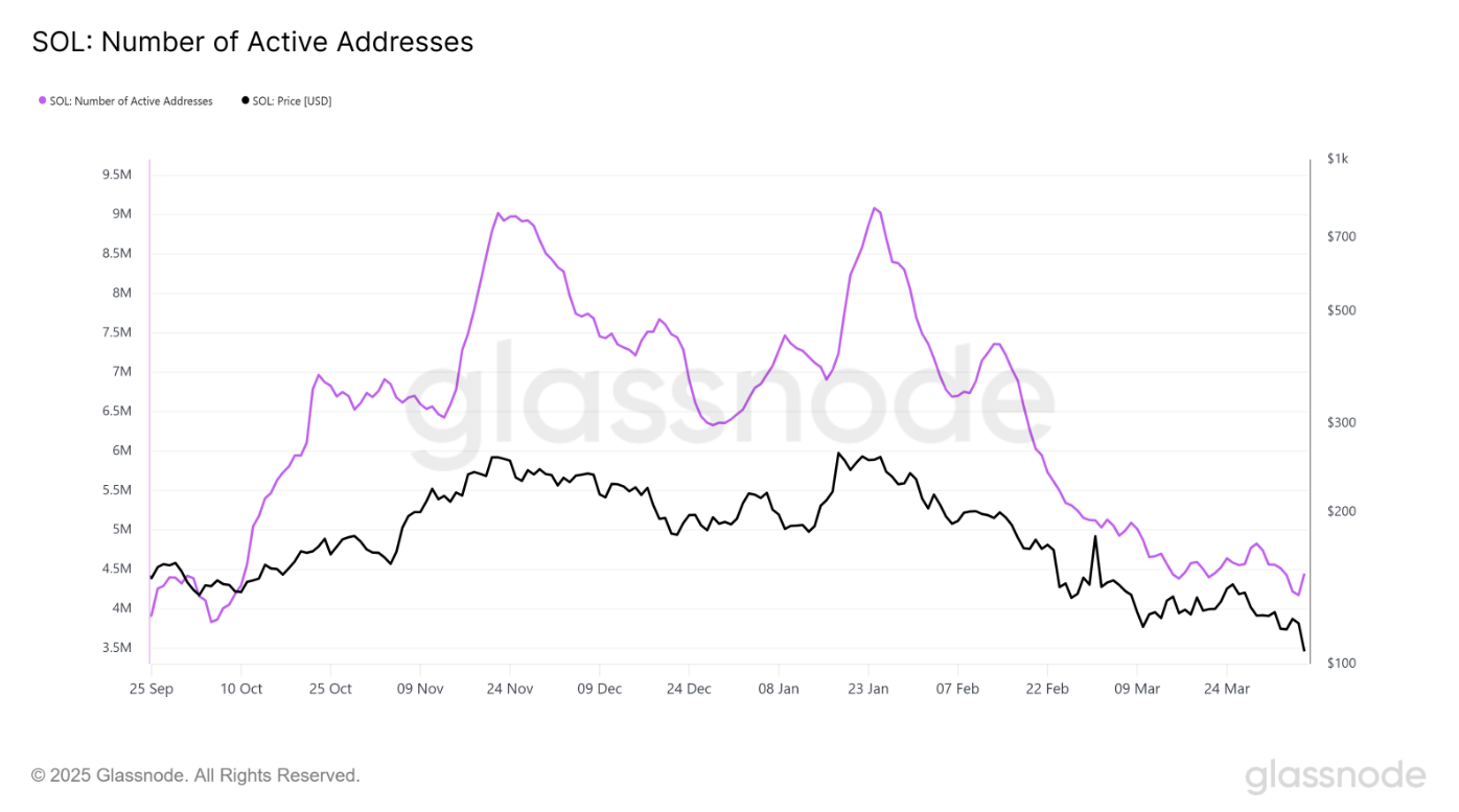 Кількість активних адрес у мережі Solana щойно досягла найнижчого рівня за останні 6 місяців, наразі зареєстровано близько 4,44 мільйона адрес з взаємодією. У порівнянні з піком понад 9 мільйонів адрес у січні, це зниження частково відображає обережний настрій інвесторів, більшість з яких схиляється до «вичікувальної позиції» і чекає на більш чіткі сигнали відновлення перед поверненням на ринок.