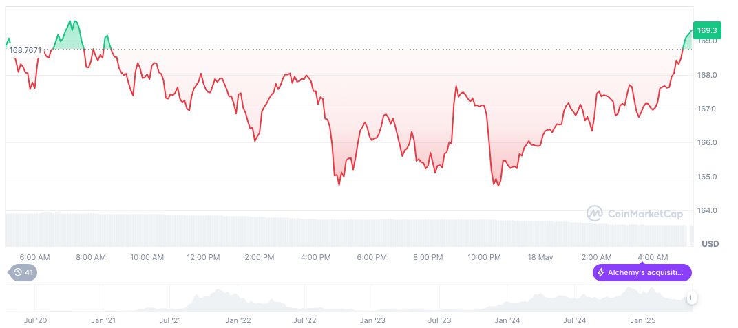 Solana (SOL) оцінюється в $169.25 з ринковою капіталізацією$87.98 мільярдів та повною ринковою капіталізацією$101.71 мільярдів, згідно з CoinMarketCap. 90-денне коливання Solana на -7.02% відображає короткострокову волатильність, проте її 30-денне зростання демонструє недавню впевненість ринку.