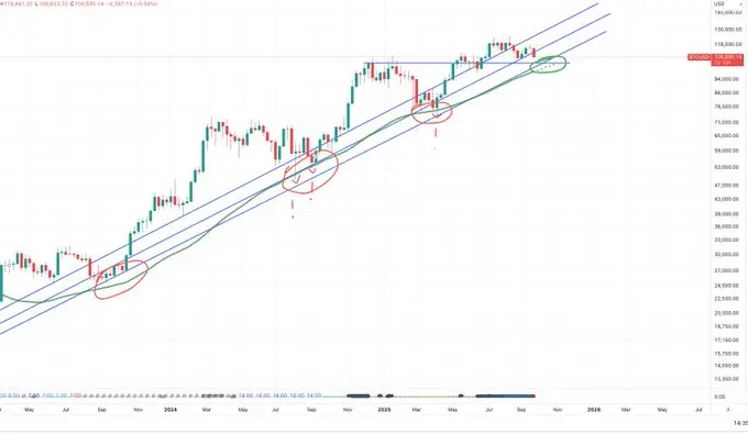 Крипто-биківський ринок у класичному технічному аналізі загалом вважається, що лише тоді, коли закриваюча ціна на тижневому графіку опускається нижче 50-тижневого ковзного середнього, биківський ринок офіційно закінчується. Наразі ціна біткоїна все ще має приблизно 10 тисяч доларів простору до цього середнього, якщо б не тривале дослідження ринку та ведення записів (або наявність відмінної пам'яті), люди могли б вже забути, що ми двічі опускалися до цього середнього, навіть неодноразово спостерігали за нижніми тінями, що його пробивали. Зараз ця середня лінія зростає і незабаром резонуватиме з рівнями підтримки в діапазоні від 98k до 104k. Історія вже має прецеденти.