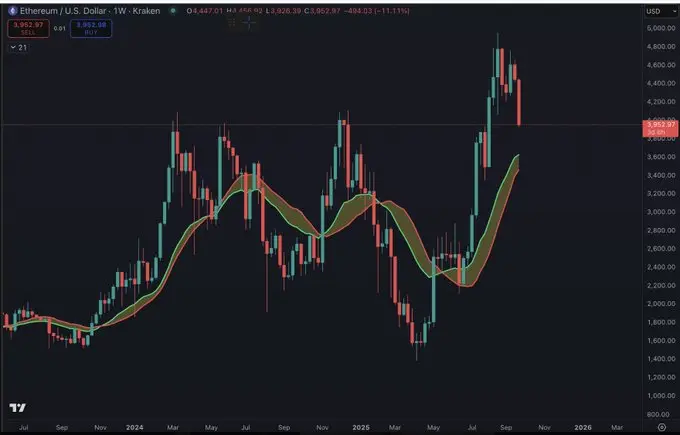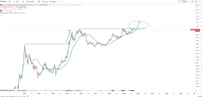 Загальна капіталізація (альткоїнів) знову помітно зустріла опір на попередньому історичному максимумі, в той час як ефір також коригується на високому рівні. 50-тижнева рухома середня поступово зростає, здається, що це відкат до цієї середньої, і до можливого прориву вгору може залишатися ще кілька місяців. Це більше схоже на бичачу формацію, а не на сигнал “закінчення циклу”.