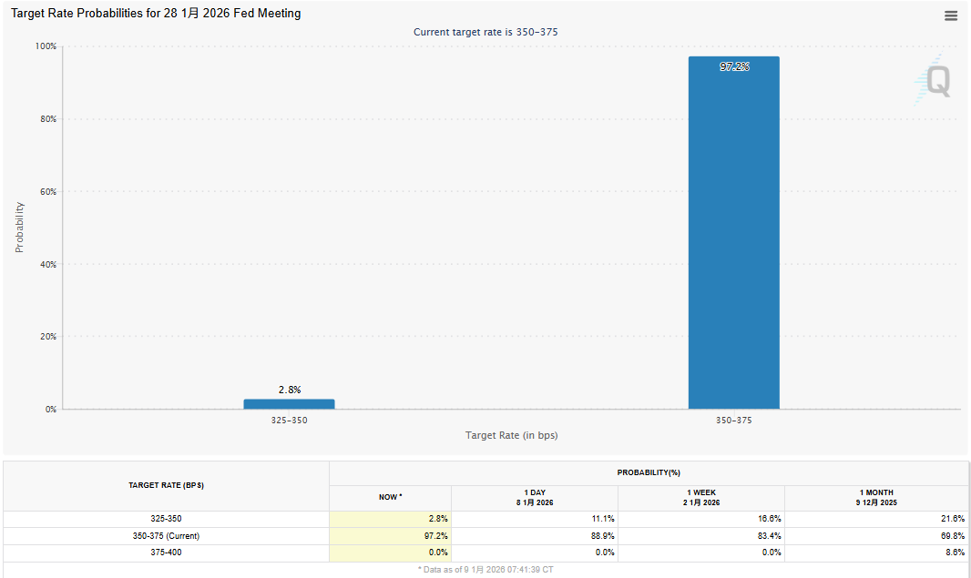 За даними останнього звіту CME FedWatch Tool, ймовірність того, що у січні Федеральний комітет з відкритих ринків (FOMC) залишить ставки без змін, зросла до 97%, що майже гарантує, що у цьому місяці ФРС не знизить ставки.
