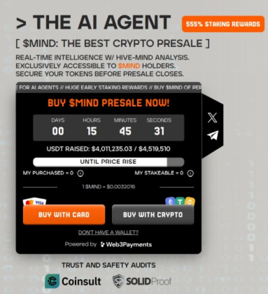 Токен $MIND щойно вийшов на попередній продаж, який вже перевищив позначку у $4M. Один токен зараз коштує $0.0032016, але ціна збільшиться через 15 годин.