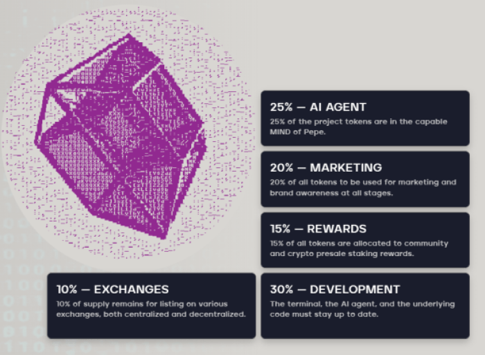 Іншими словами, це мемкойн, простий і зрозумілий, як інші нові мем-койни з великим потенціалом прибутку у 2025 році. Тут немає складної дорожньої карти, немає штучного інтелекту, лише вібрація, токен та NFT. Токеноміка відображає спрощені пріоритети, з великою перевагою більш як половина доступних токенів (270B) зарезервована для попередньої продажу.