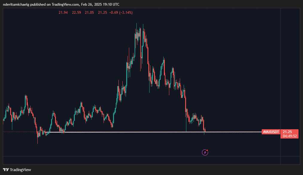 Ціна впала приблизно на 22% від максимуму за 7 днів до мінімуму. AVAX помітно відступив нижче листопадових мінімумів і нещодавно намагався пройти повторний тест на підтримку біля рівня ціни у $21.