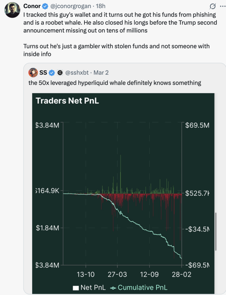 Кит використав $4 мільйони, щоб створити позицію на $200 мільйонів, роблячи ставку в 50 разів на зростання BTC та ETH, і закривав більшість угод протягом дня, ідеально вирівнюючись з постом Трампа у Trump’s Truth Social близько 8:05 PST, в якому згадувалися BTC, ETH, XRP, SOL та ADA для резерву.