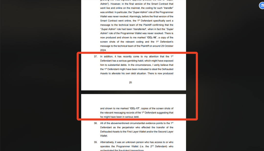 У тексті одного з присяжних свідчень позивач зазначив: нещодавно я дізнався, що перший відповідач має серйозну звичку до азартних ігор, через що він, можливо, накопичив величезні борги. Я вірю, що це спонукало його вкрасти активи, що підлягають справі, щоб полегшити свої борги. Позивач також подав скріншоти відповідних повідомлень, щоб довести, що перший відповідач, можливо, опинився у величезних боргах. (Позивач стверджує, що відповідач згодом став одержимим, щодня використовуючи 100-кратний важіль для укладення контрактів)