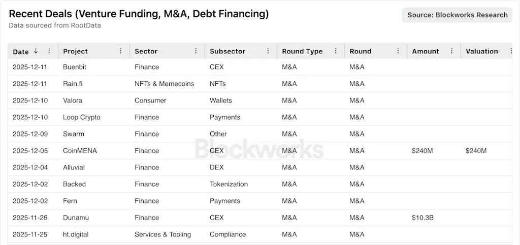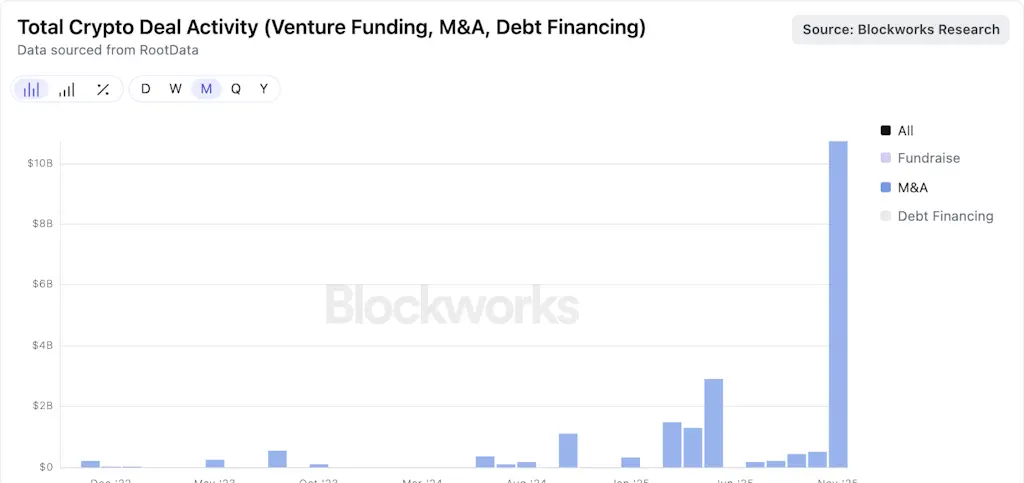 Активність у сфері M&A у криптоіндустрії зазнала різкого зростання. Обсяг M&A у листопаді 2025 року досяг приблизно $10.7 мільярдів, що в основному зумовлено великою покупкою у сфері бірж. У третьому кварталі 2025 року обсяг крипто M&A вперше перевищив $10 мільярдів, подвоївши попередній рекорд $5 мільярдів і збільшившись у 30 разів порівняно з тим самим періодом 2024 року.