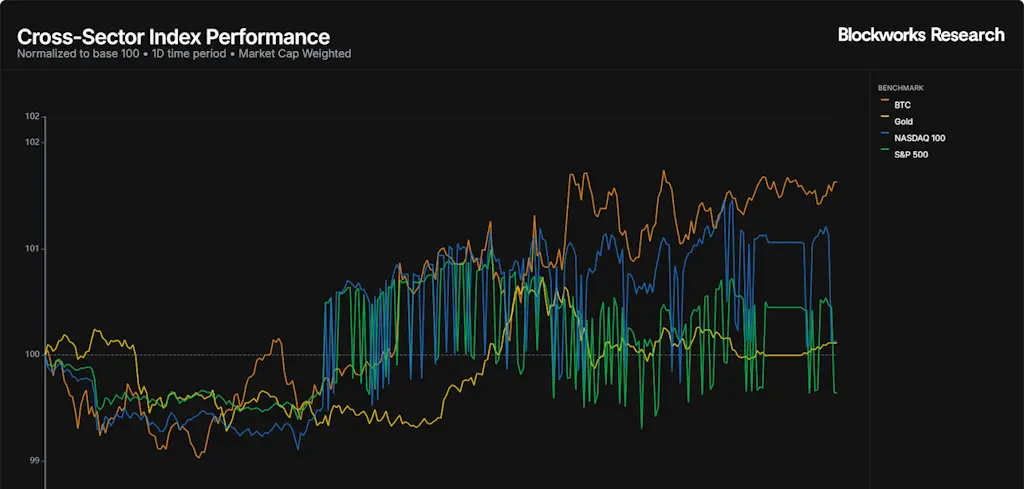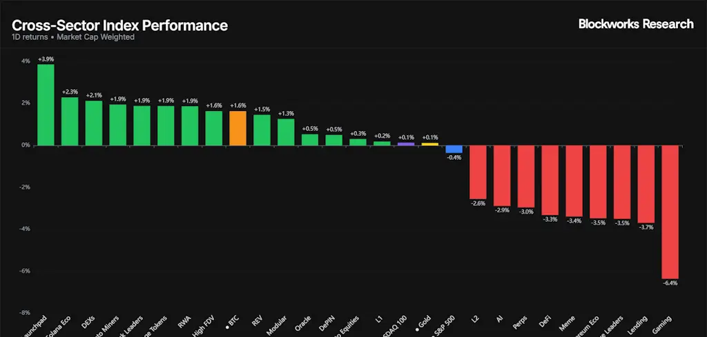 Ринки трималися з помірним ризиком, з криптовалютами та активами зростанням на чолі. BTC перевищив (+1.6%), тоді як традиційні активи залишилися стабільними. У криптовалюті агресивна ротація у торгові теми визначила ситуацію: Launchpads (+3.9%) лідирували, за ними йшла екосистема Solana (+2.3%) та DEXs (+2.1%). Ігрова індустрія (-6.4%) була явним аутсайдером, з Lending (-3.7%), Revenue Leaders (-3.5%), Ethereum-екосистема (-3.5%) та Memes (-3.4%), що зазнали різких падінь.