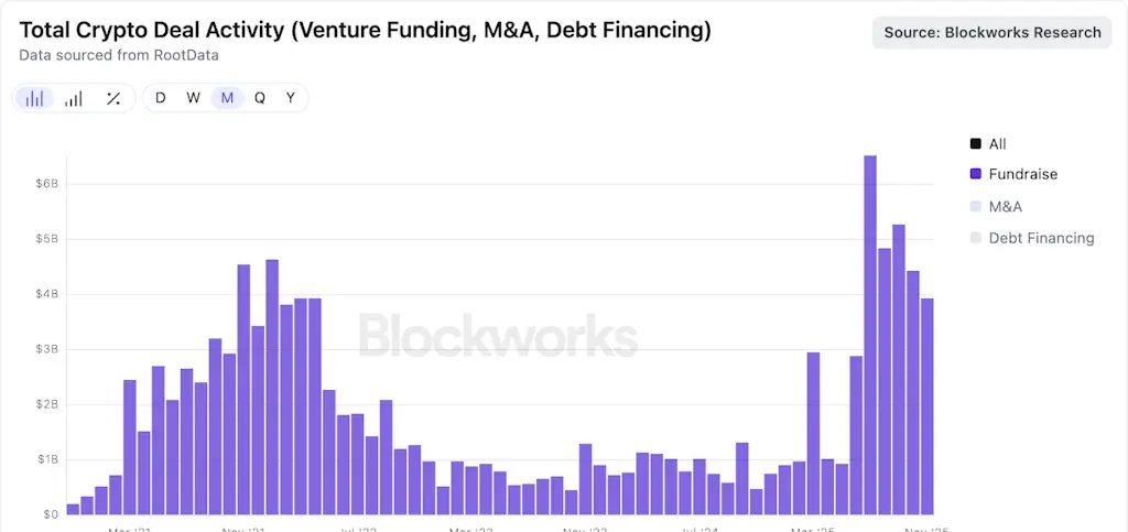 Залучення капіталу у криптоіндустрії зросло приблизно на 41%: з попереднього піку циклу у $4.63 мільярдів у січні 2021 до нового максимуму $6.52 мільярдів у липні 2025. Пікові показники залучення капіталу припали на липень 2025 року, коли воно сягнуло $6.5 мільярдів, після чого знизилося до приблизно $4-5 мільярдів щомісяця у третьому та четвертому кварталах.