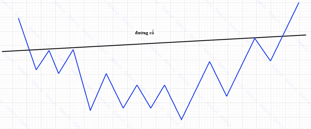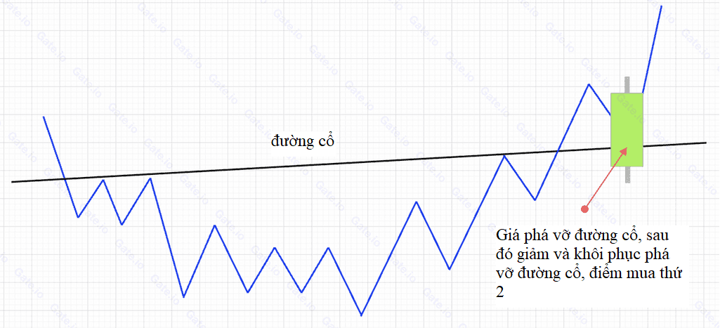 2.Điểm mua vào thứ hai trong mô hình đáy tròn là khi giá phá vỡ đường cổ của đáy tròn, những người mua tham gia thị trường, và giá thường sẽ điều chỉnh. Khi giá ổn định trở lại trên đường cổ, nó sẽ trở thành điểm mua vào thứ hai, như hình minh họa dưới đây.