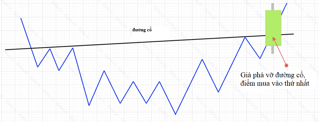 1.Điểm mua vào đầu tiên trong mô hình đáy tròn: là khi nó phá vỡ đường cổ, là điểm mua vào đầu tiên.