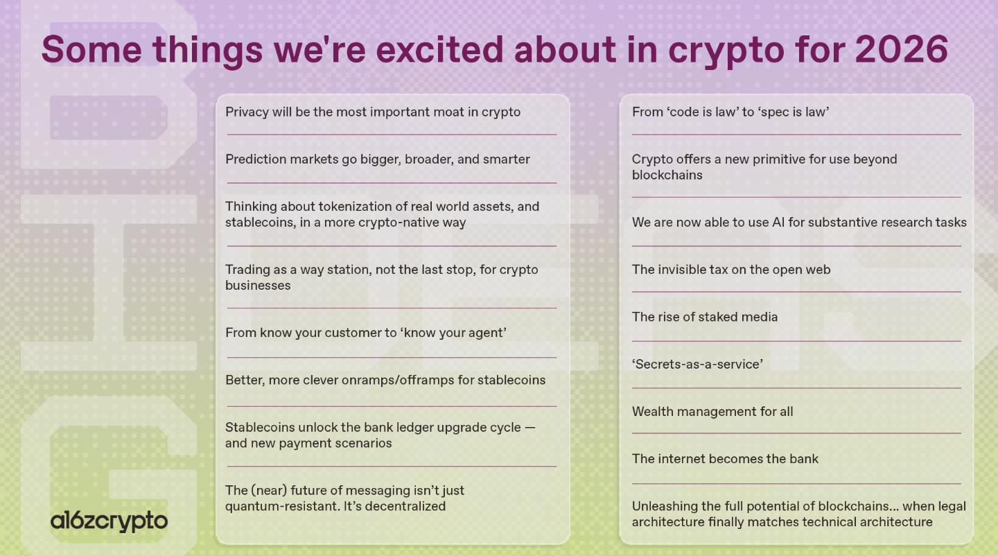 a16z phát hành Báo Cáo Triển Vọng Crypto năm 2026, tập trung vào RWA, Stablecoin, AI Agents và quyền riêng tư On-Chain